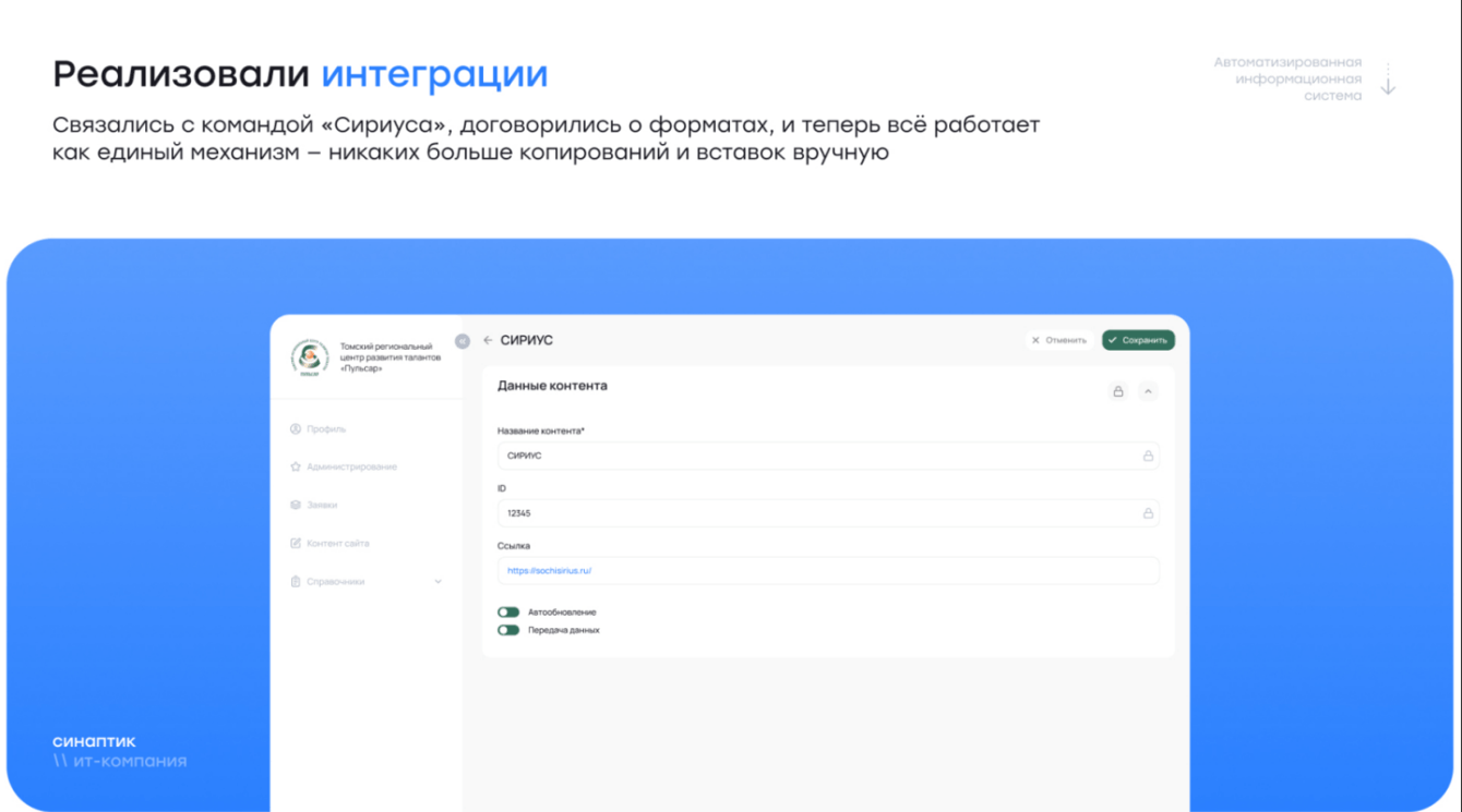- Отсутствие интеграции: Система не могла обмениваться данными с внешними платформами, такими как «Сириус», что мешало эффективной работе.