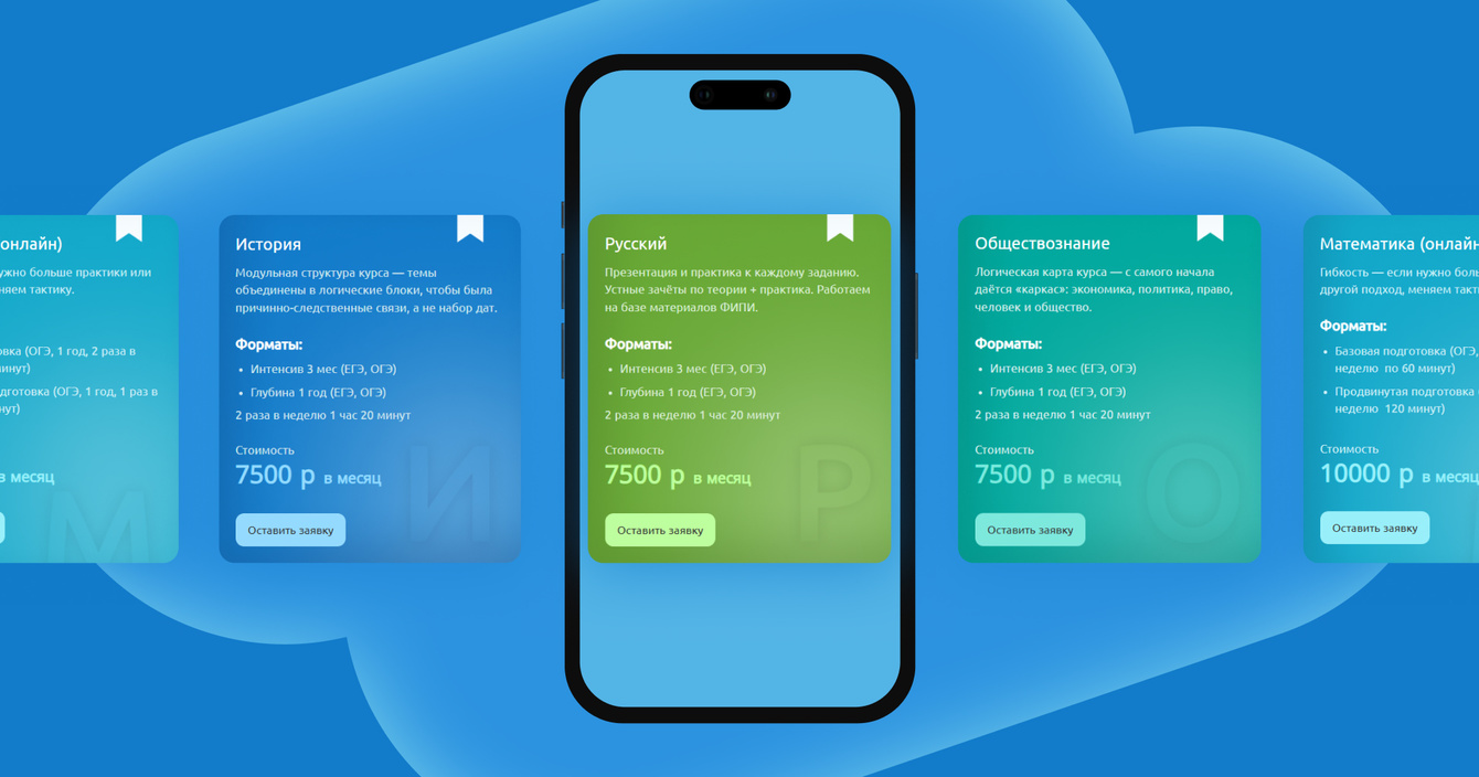 Ключевые разделы сайта – «Подготовка к ЕГЭ/ОГЭ», «Базовый курс» и «Интенсив». Каждая внутренняя страница структурирована так, чтобы пользователь быстро понял, в чём суть программы и чем она отличается от других. Поэтому информацию решили подавать блоками: короткий текст, чёткий акцент, понятная кнопка действия.
