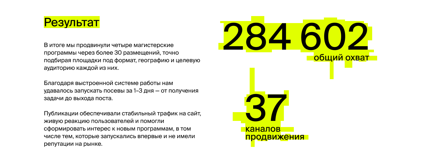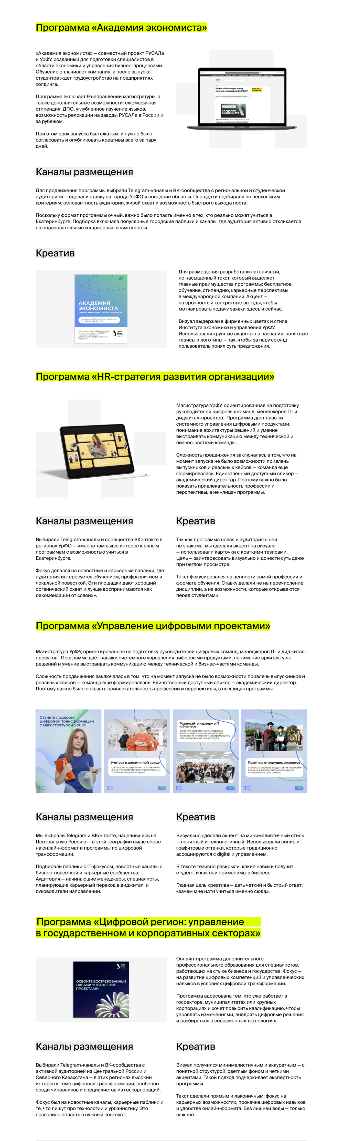 Важно было учесть географию: для очных программ — продвигаться в регионах, близких к УрФО, для онлайн и заочных — в Центральной России и ближних странах. Также нужно было адаптировать подачу под особенности каждой программы: разный формат обучения, разные целевые группы.