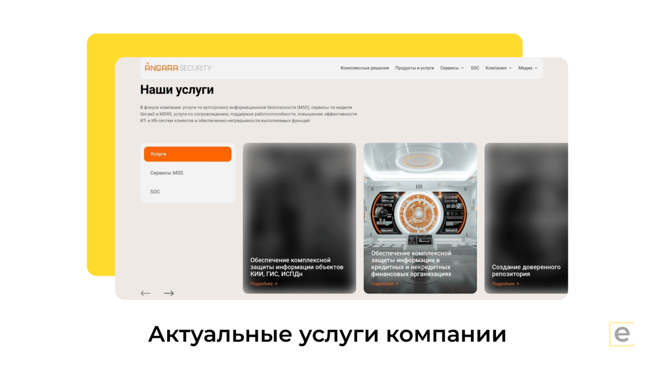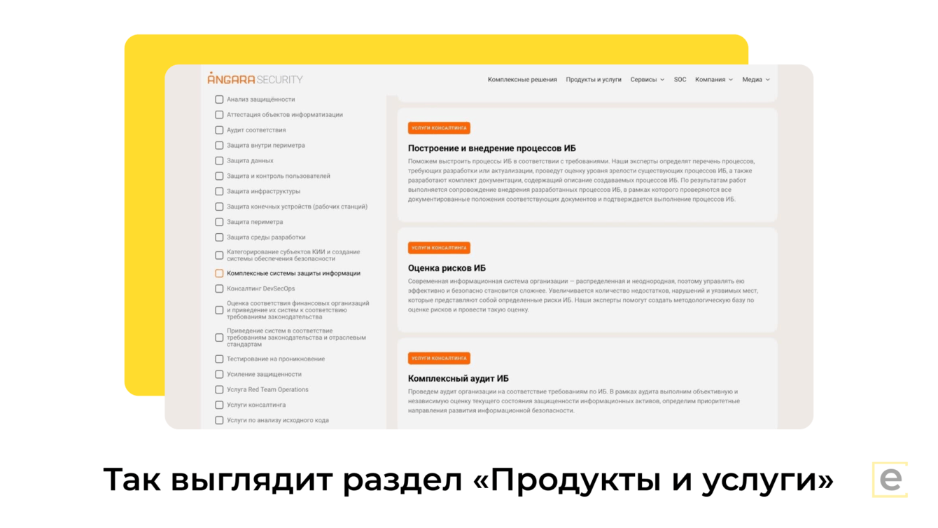 Услуги (а у Angara Security их более 50) тоже не были упакованы до конца. Поэтому мы помогали и с проработкой дизайна, и с описанием продуктовой линейки.