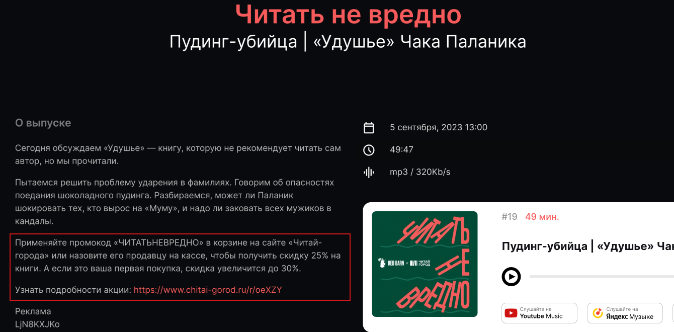 В самом выпуске была отсылка на спонсорский текст в описании с промокодом.