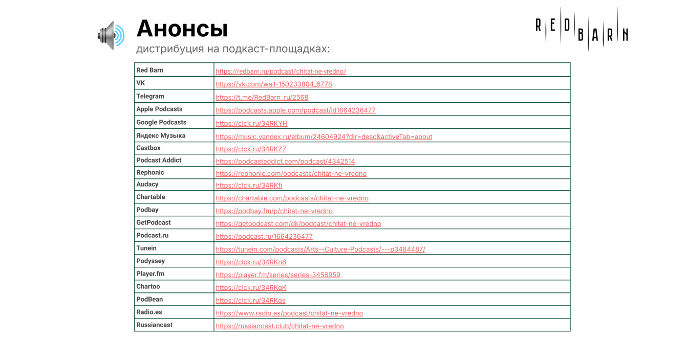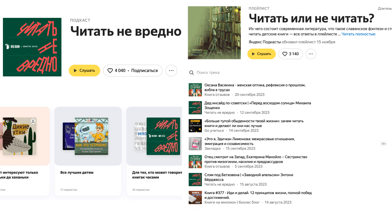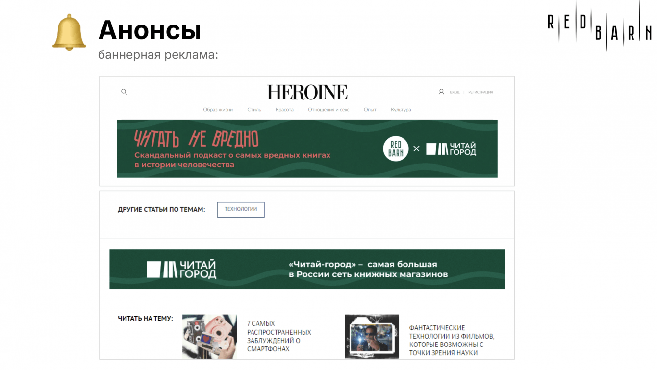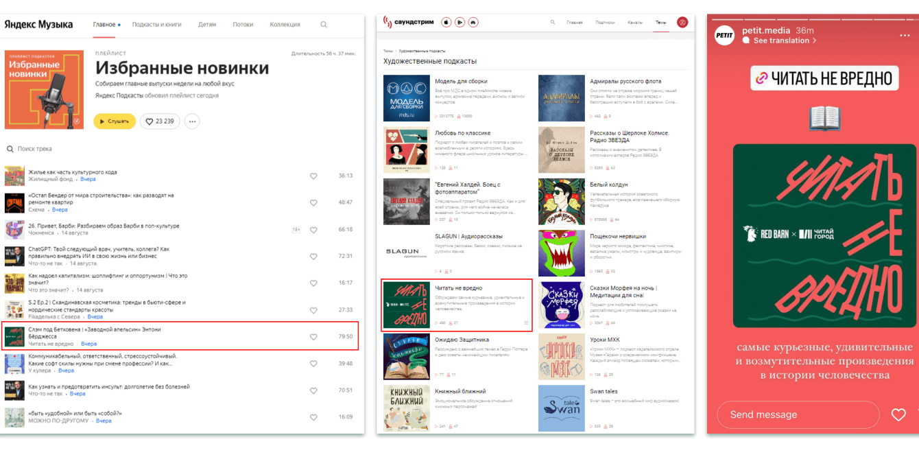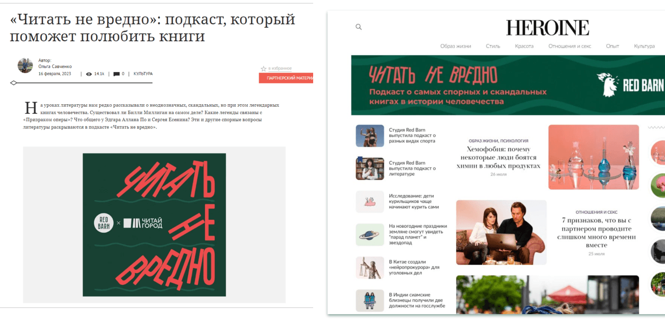 Мы разместили рекламные интеграции в подкасте «Читать не вредно». Это редакционный подкаст студии RedBarn (студия медиахолдинга DoubleDay), который уже завоевал свою лояльную аудиторию и постоянно входит в чарты и подборки на аудио-платформах (Я.Музыка, Apple Podcasts и тд.).