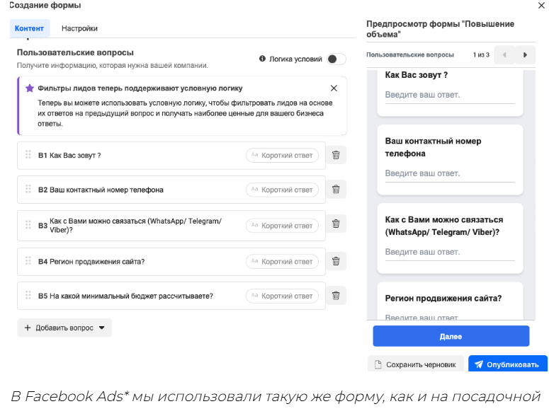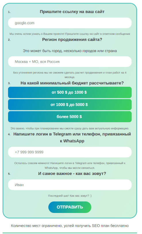 Вопросы в форме помогли нам отфильтровать лиды и сразу оценить их качество . Например, мы спрашивали о бюджете на SEO и установили минимальную планку в 500$, что помогло отсеять тех, кто не был готов к полноценному продвижению .