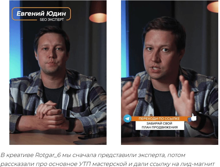 Мы протестировали более 40 креативов . Самым успешным оказался ролик, который принёс 200 конверсий . Его записал сам владелец бизнеса по нашему сценарию.