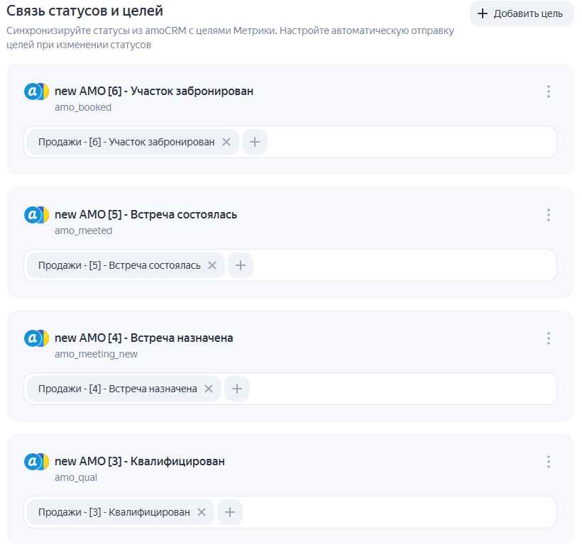 В тот момент официальной интеграции Метрики с AMO CRM ещё не было, поэтому мы использовали сторонний виджет F5. Он связывал сделки в AMO с визитами в Метрике по client_id и передавал этапы воронки как достижения целей. На этих данных обучались кампании. Ограничение было одно: если в сделке не было client_id, цель не передавалась — такие случаи всё же встречались.