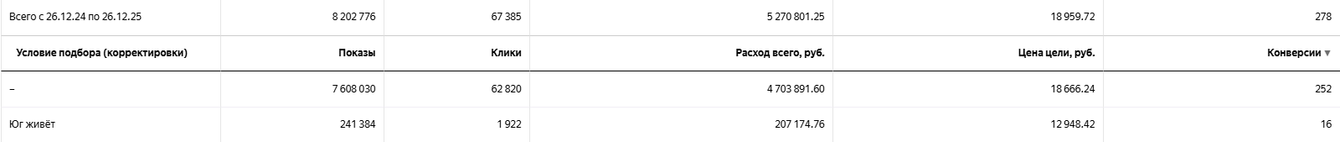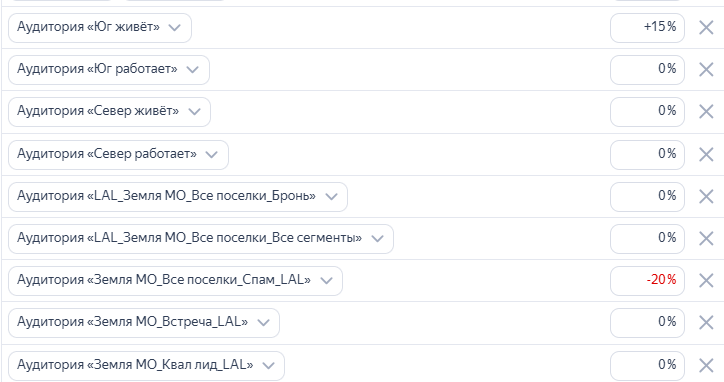 Перед тем как менять настройки по аудиториям или вводить корректировки, мы добавляли нужные сегменты в кампании с нулевой корректировкой. Такой мягкий метод позволял проверять гипотезы без дополнительного бюджета и без запуска отдельной рекламной кампании. Например, мы собирали аудитории по географии — отдельно юг, север, запад и восток Москвы — и наблюдали, как эти сегменты ведут себя в общей статистике. По результатам уже принимали решение о корректировках или о запуске отдельных кампаний — в нашем случае мы делали положительные корректировки на жителей юга Москвы.