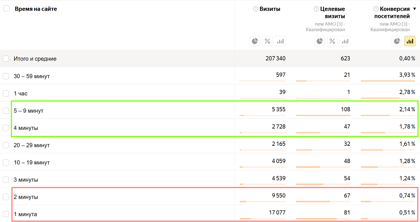 Постепенно мы начали углубляться не только в источники трафика, но и в поведение пользователей. Анализ показал, что чем больше времени пользователи проводят на сайте, тем выше у них конверсия в целевую заявку.