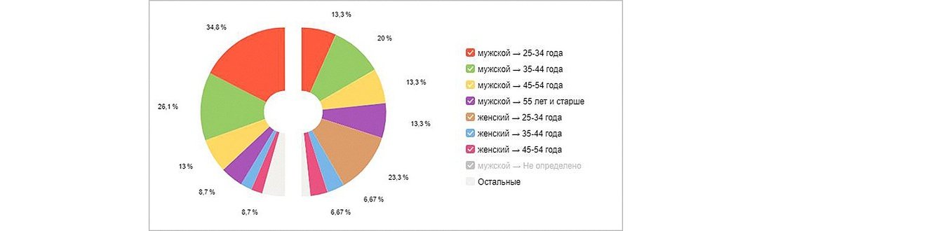 Аудитория сайта в целом – преимущественно мужчины 25-55+ лет. Среди них самая многочисленная группа – это 35-44 года. Кроме того, стоит отметить, что в рекламном трафике доля женщин больше, чем на поиске.