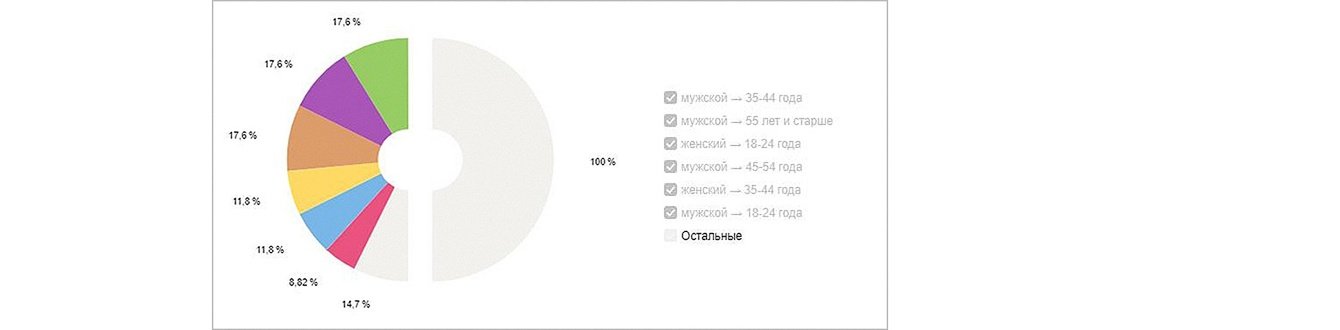 Проанализировав ЦА в различных срезах по полу и возрасту, мы пришли к выводу, что женская аудитория до 24 лет, а также от 55 и старше – это балласт для нашей рекламной кампании. Поэтому следующим шагом мы внесли понижающие корректировки на показы в Рекламной сети Яндекса (РСЯ) -100% для этих групп, исключив их из ЦА.