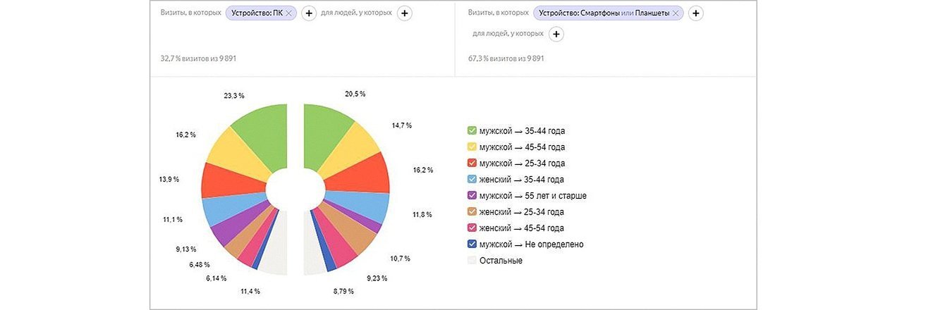 Мы провели ряд сравнений трафика с разбивкой на сегменты по половозрастным характеристикам и типу устройства.