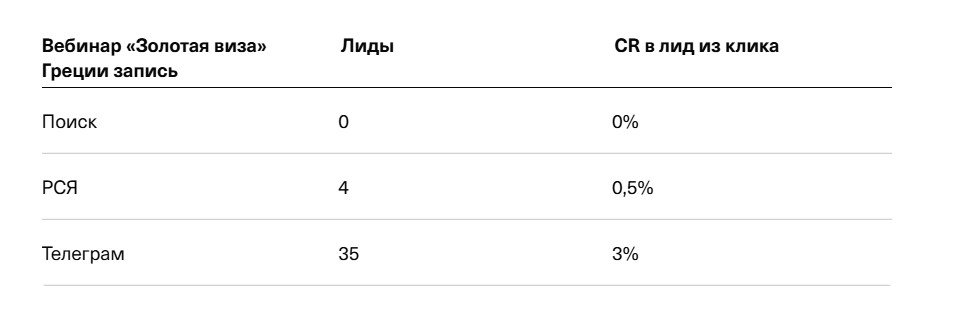 Tranio организовал вебинар о "Золотой визе" Греции. Агентству Alteasy нужно было привлечь регистрации на вебинар. Изначально использовались стандартные инструменты Яндекс Директа – поисковая реклама и РСЯ, но конверсии были единичными. Тогда мы решили протестировать рекламу в Телеграм-каналах, ожидая, что она привлечет новую целевую аудиторию.