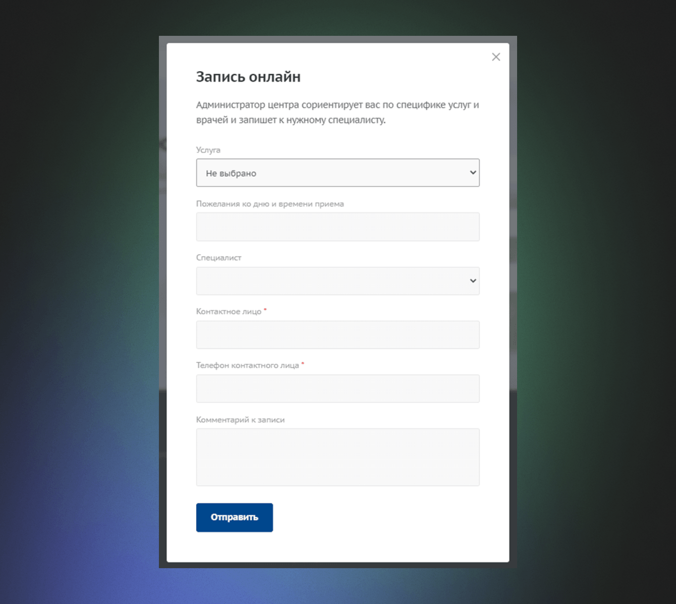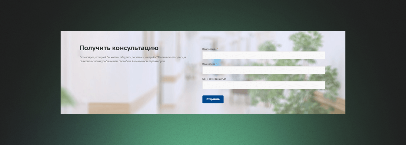 В отличие от предыдущей версии сайта, где коммуникация с клиникой ограничивалась телефоном и Skype, мы внедрили две различные формы онлайн-записи. Первая форма предназначена для пациентов, готовых к обращению в центр.