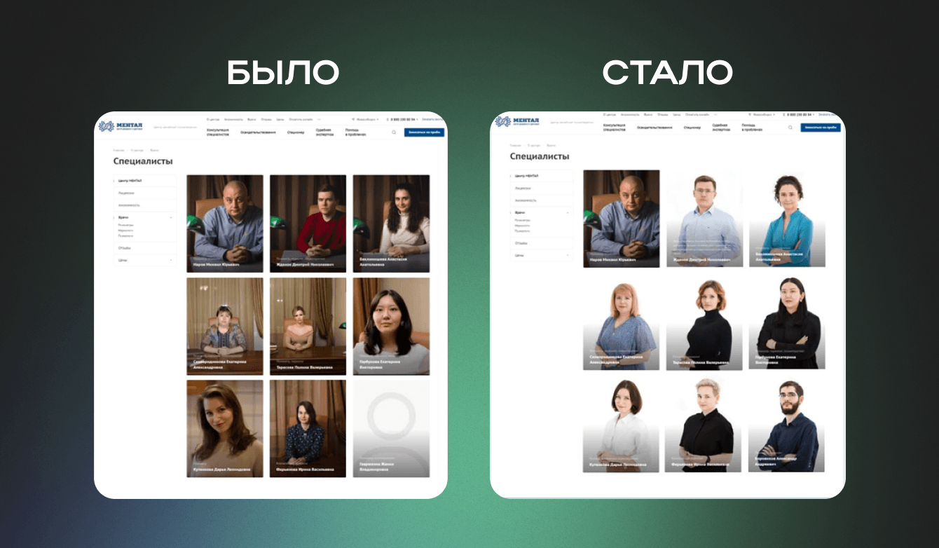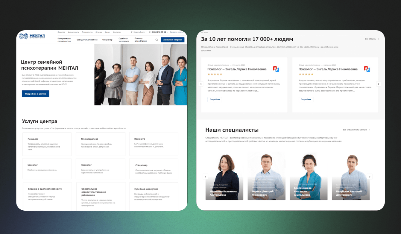 Мы настояли, что важно подчеркнуть то место, куда мы хотим привлекать аудиторию. Лицо клиники – это специалисты, что там работают. Клиенту порекомендовали фотографов, специализирующихся на портретных снимках. Через три недели получили фотографии врачей и персонала, после чего до конца оформили раздел с командой медицинского центра Ментал.
