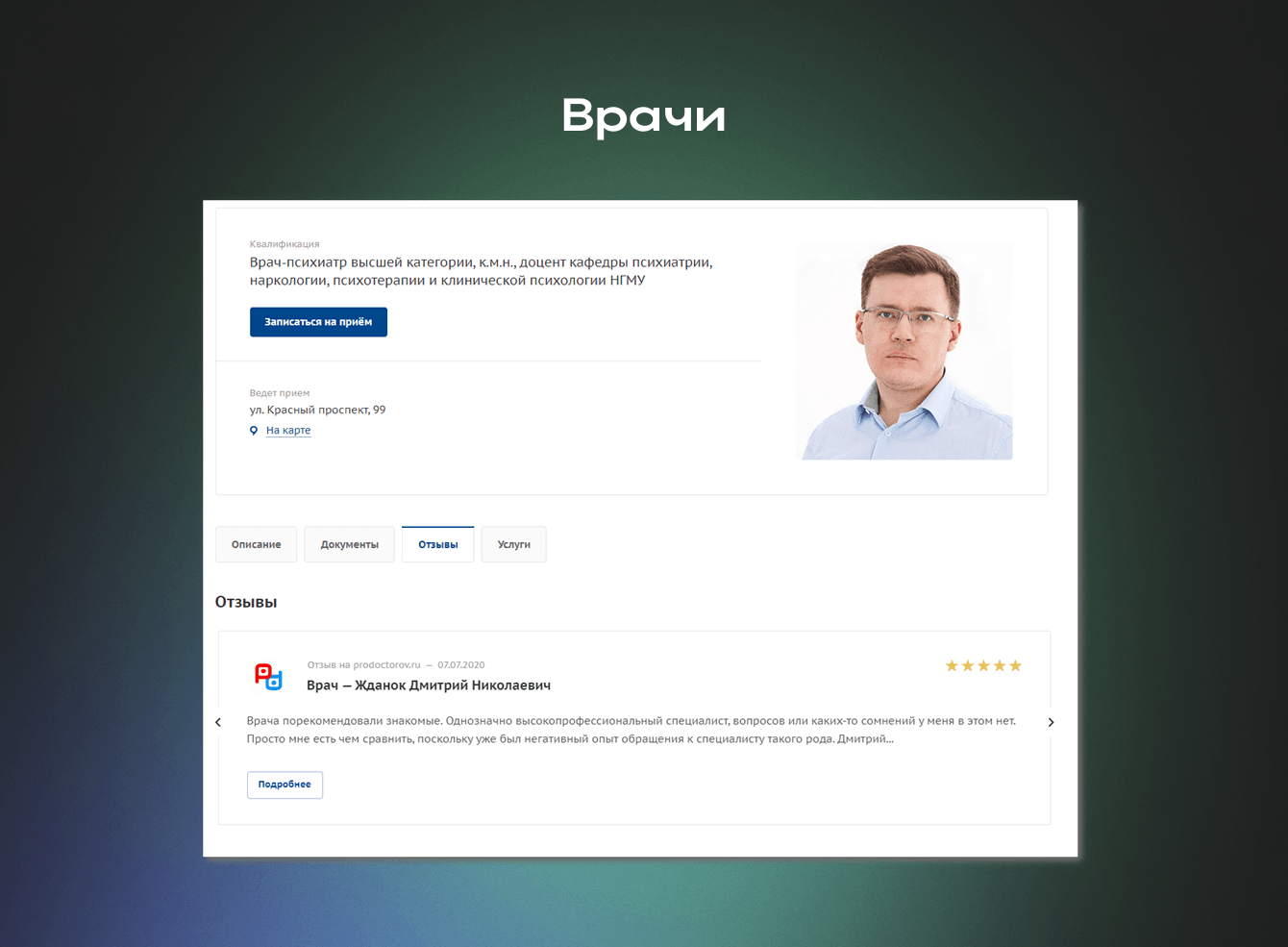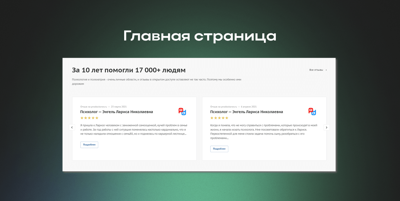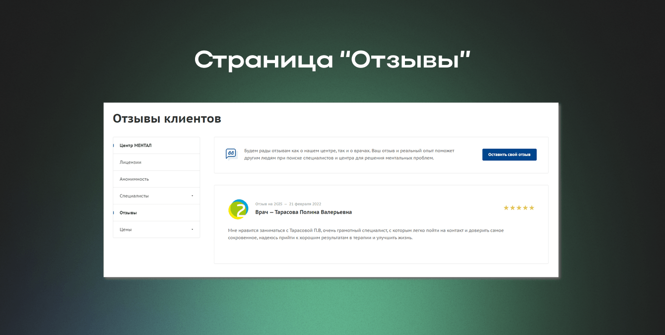 Мы реализовали дополнительный проект по агрегации и систематизации отзывов пациентов с ведущих платформ: 2ГИС, Яндекс.Карты, Google Карты и Продокторов. В результате для каждого специалиста клиники (всего 22 врача) был сформирован персонализированный портфель отзывов реальных клиентов.