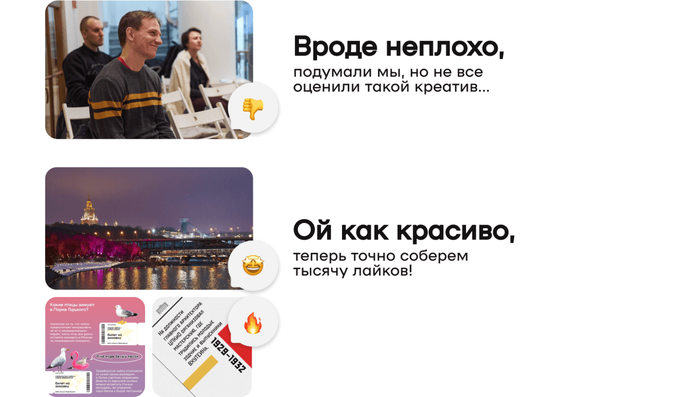 Перемен требовал и ToV. Мы поняли, что Парк Горького не может говорить оборотами «состоялось мероприятие, в котором приняло участие N человек». Из нас рвалось наружу всё это дружелюбно-веселое и культурно-спонтанное: «друзья!», «камбэк года», «кто после работы с нами на каток?» Так появился иронично-дружеский стиль общения, который отличает телеграм-канал Парка Горького от других похожих площадок. Вскоре мы стали получать обратную связь от коллег из сферы пиар, которые стали читать нас «просто потому, что интересно». Так мы поняли, что находимся на правильном пути.
