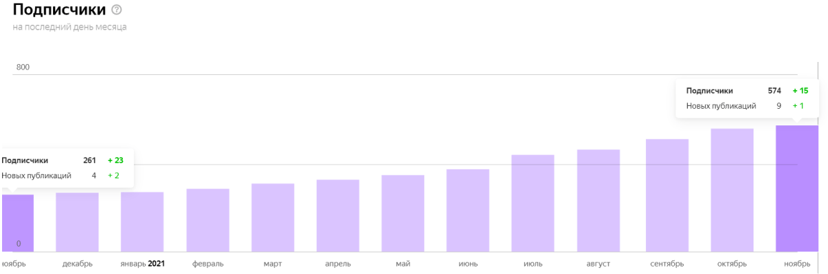 Работа над проектом ведется и в настоящее время, однако промежуточные итоги уже можно подвести. За год нам удалось увеличить число подписчиков в 2 раза, отрегулировать выпуск контента, отражать актуальные тренды в выпускаемых публикациях, определить факторы, которые влияют на рост просмотров. И, конечно, мы подтвердили теорию о том, что котики правят миром. В подтверждение сказанному выше статистика визитов пользователей на канал с ноября 2020 года по настоящее время.