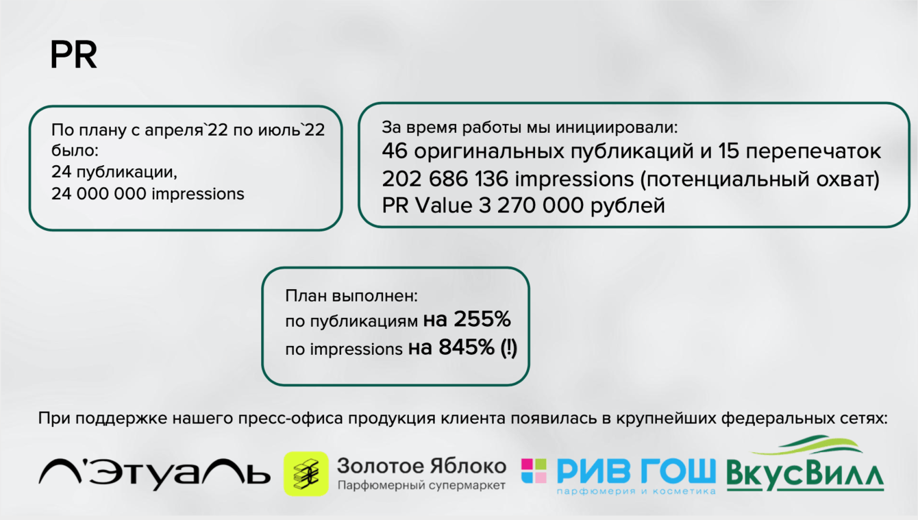 По плану с апреля`22 по июль`22 было: 24 публикации, 24 000 000 impressions.