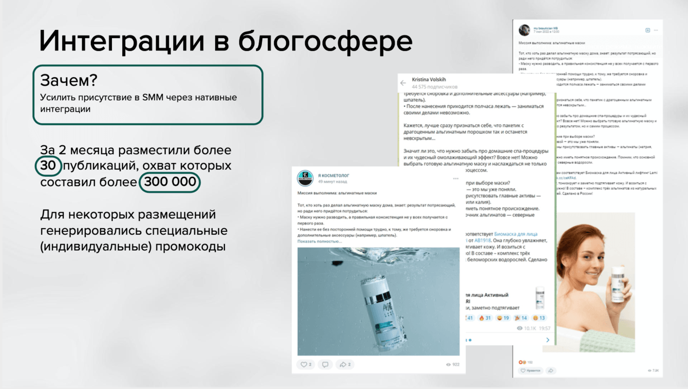 1. Усилили присутствие в SMM через нативные интеграции. За 2 месяца разместили более 30 публикаций, охват которых составил более 300 000. Для некоторых размещений генерировались специальные промокоды.