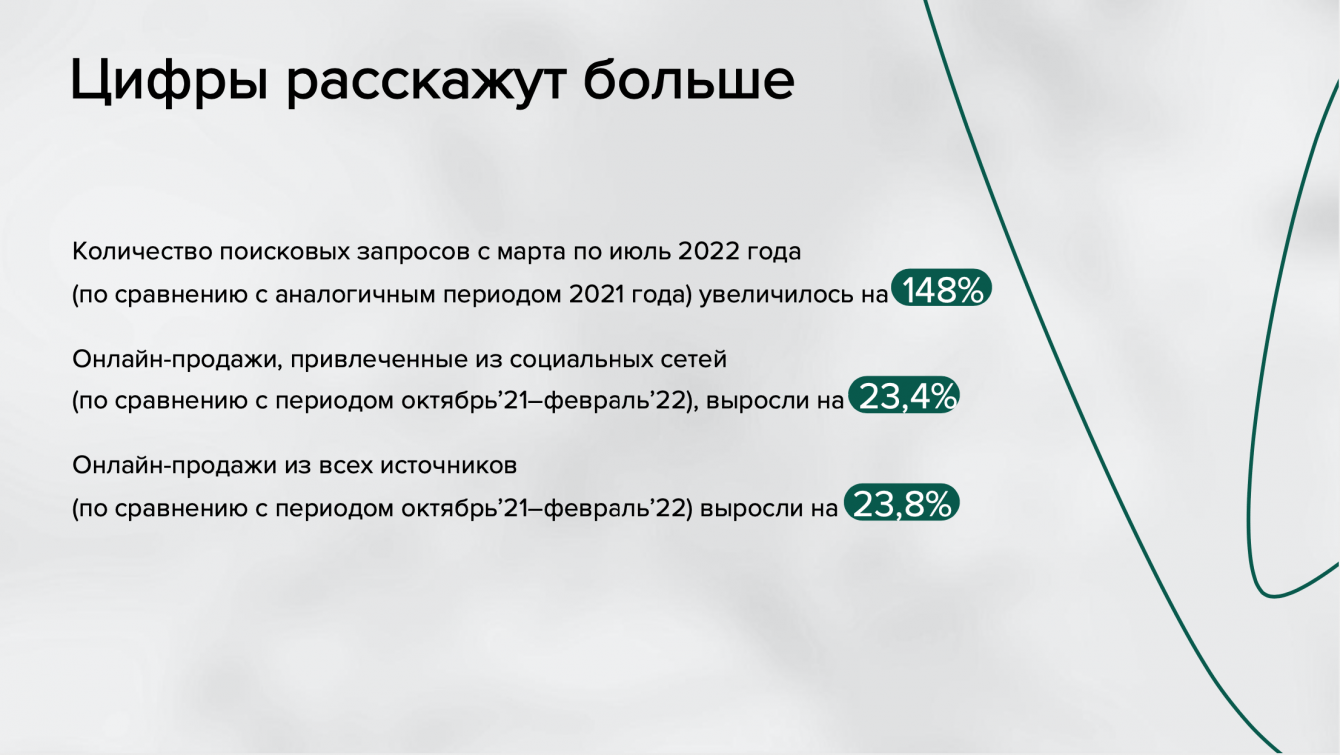 – Онлайн-продажи, привлеченные из социальных сетей (по сравнению с периодом октябрь’21 – февраль’22) выросли на 23,4%.