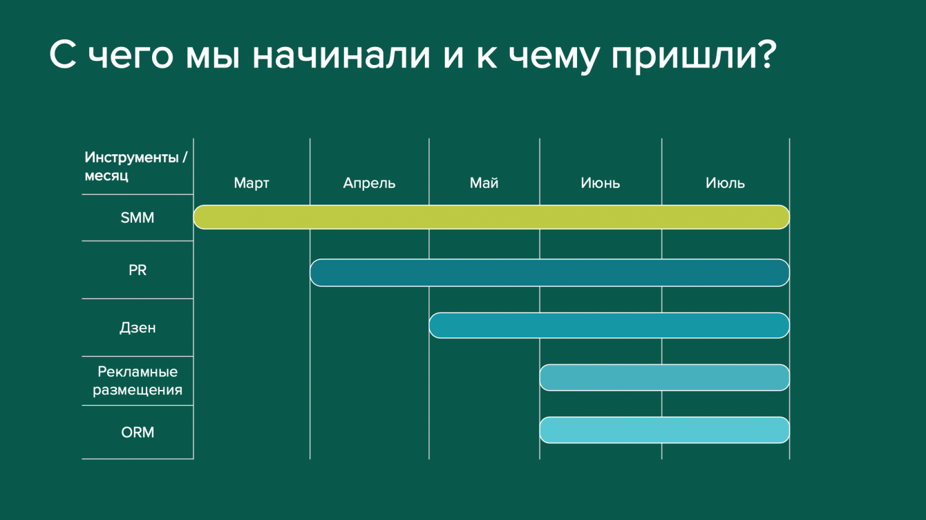 Сначала мы усилили работу по SMM, дополнив его комплексным digital-продвижением с помощью инструментов: PR, Дзен, рекламных размещений, ORM. С помощью выбранных инструментов, каждый из которых усиливал друг друга, мы работали на всех стадиях CJM.