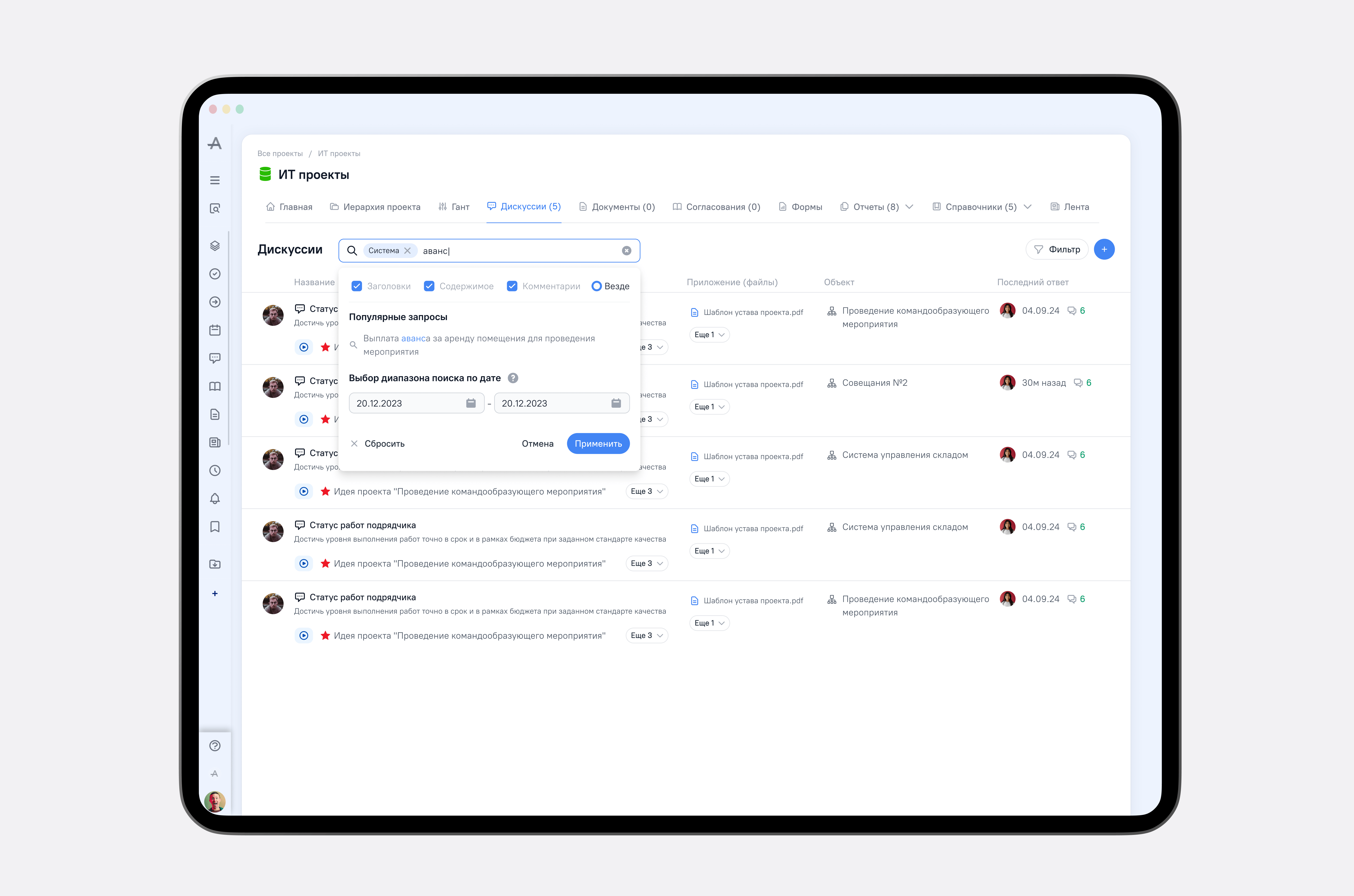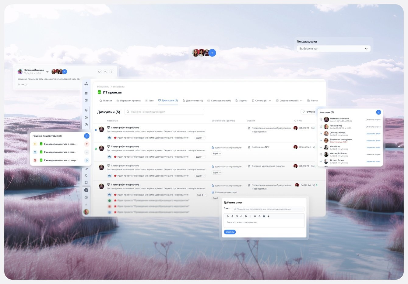 Раздел дискуссий позволяет подключаться к обсуждениям, видеть авторов и оставлять комментарии. А на странице согласований можно увидеть количество участников, связанные обсуждения и артефакты проектов.