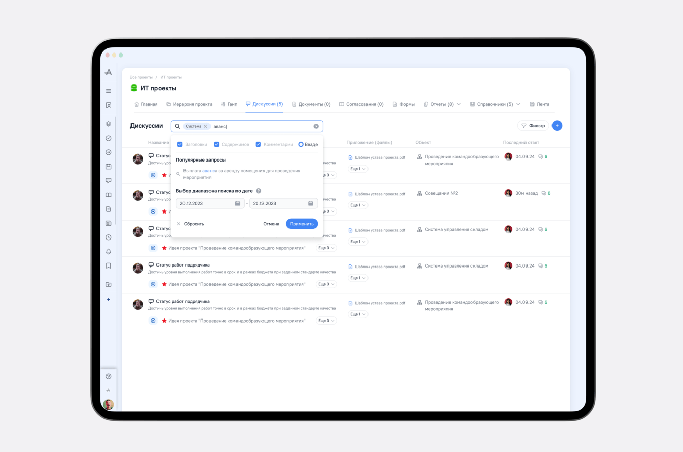 Документы теперь легко связывать с согласованиями и обсуждениями — один файл может участвовать в нескольких процессах одновременно. Интуитивные иконки показывают связи, а умный поиск по иерархии помогает быстро найти нужный документ через путь к папке.