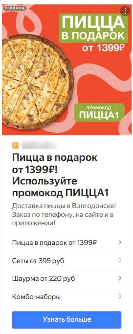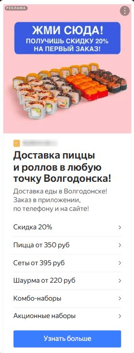 Начали с поиска. Запустили объявления по запросам «пицца Волгодонск», «роллы с доставкой», «заказать суши». Логика простая: человек уже ищет, значит, готов заказать. В большом городе такая стратегия часто даёт быстрый результат.