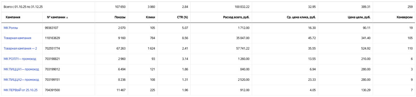 Параллельно запустили пять мастер-кампаний под разные акции. Три общие — для широкого охвата. Одна — на первый заказ, чтобы мотивировать новичков. И ещё две — отдельно для пиццы и для роллов, с конкретными промокодами.