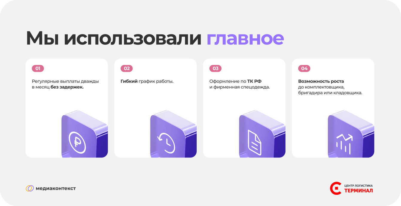 Все вакансии предполагали способность к физическому труду и нагрузкам, но в отличие от всех подобных предложений, мы подчеркнули, что это не разовые подработки, а полноценная должность с высокой оплатой труда, стабильным графиком, социальными льготами, защитой сотрудника и возможностью карьерного роста. В этой нише такое предложение — редкое и выделяющееся само по себе.
