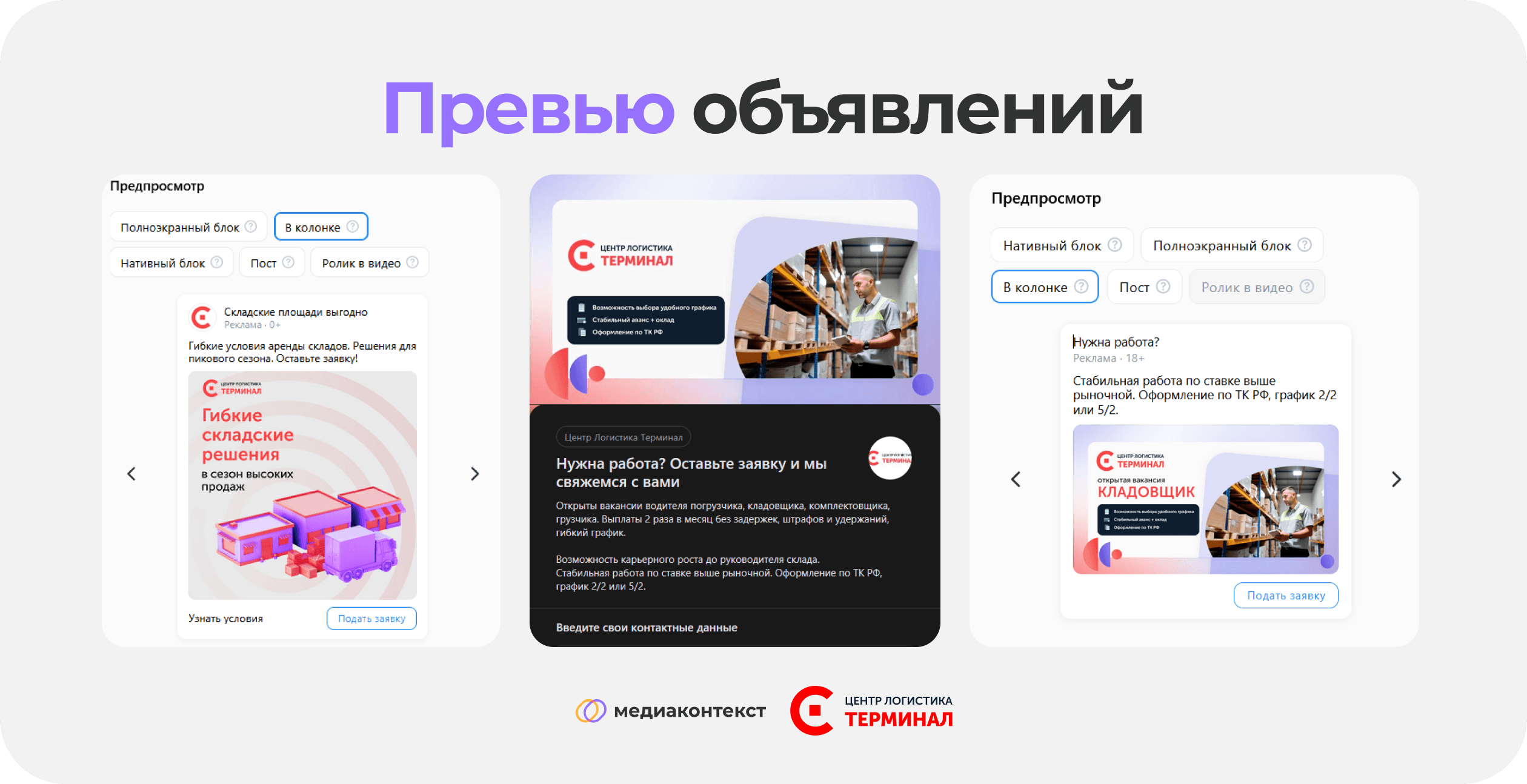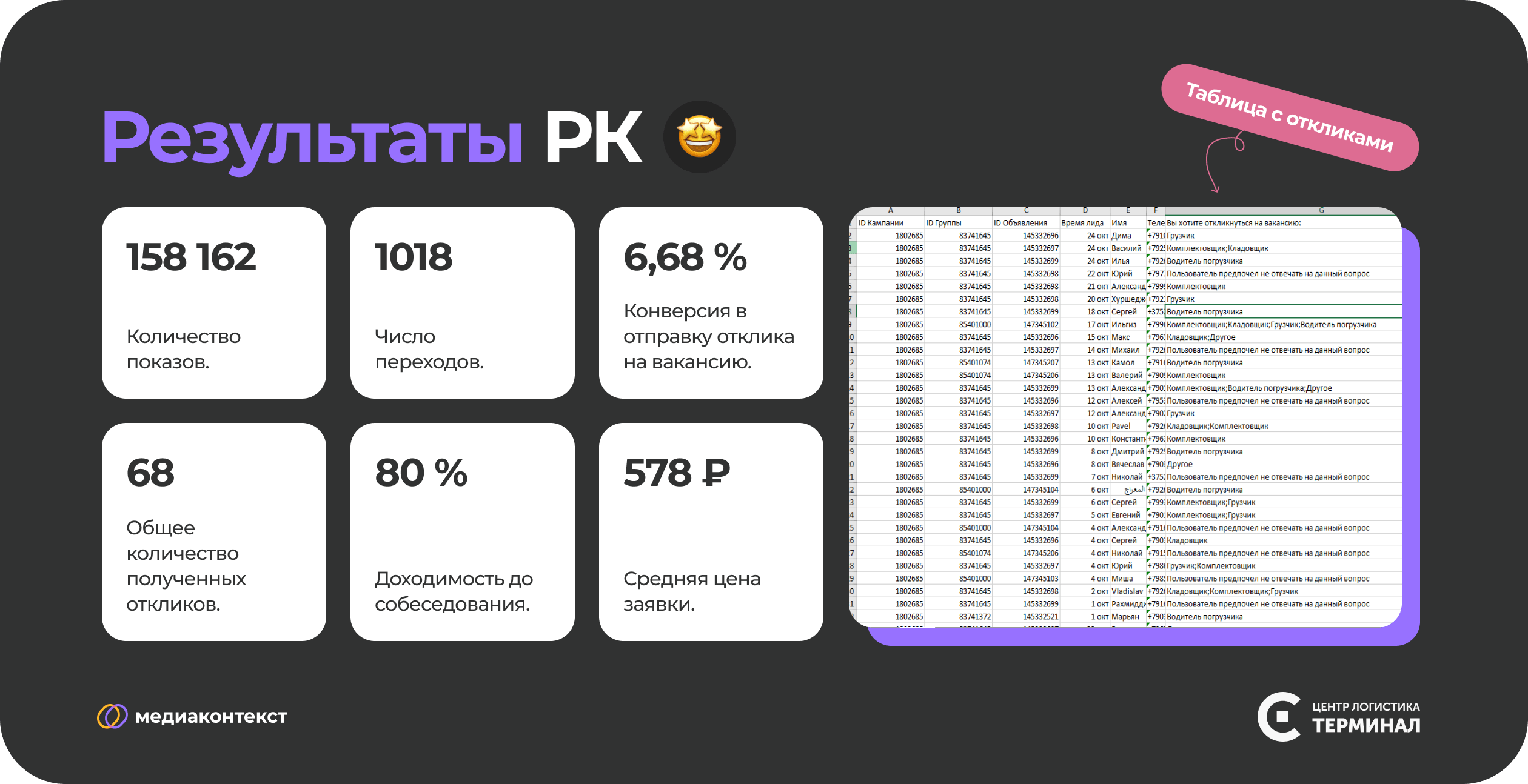 В тестовом периоде мы запустили рекламные кампании, направленные на страницу сайта клиента, где размещено подробное описание всех вакансий с возможностью немедленной отправки заявки.