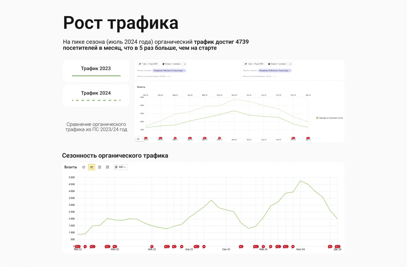 Для дальнейшего роста планируем продолжать работу над блоговой частью, расширяя охват информационных запросов. Укреплять ссылочный профиль, делая акцент на качественные региональные ресурсы. Переходить на круглогодичное SEO-продвижение, чтобы стабилизировать результаты в несезон.