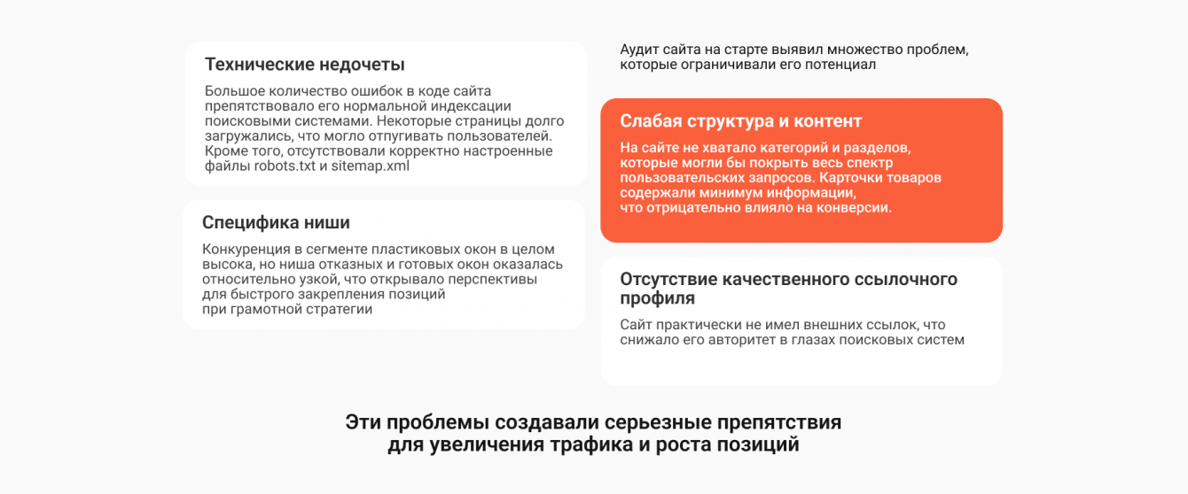 - Сайт не имел оптимизированной структуры, не использовал потенциал SEO, а ссылочный профиль практически отсутствовал.