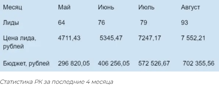Тестировать кампании начали в июле-августе, в таблице ниже видно, что количество заявок увеличилось, но серьезно выросла стоимость лида. Конверсия кампаний по серийной мебели оказалась в 3 раза ниже, чем мебели на заказ.