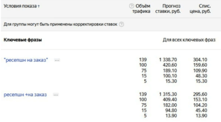 Получилась интересная ситуация: в личном кабинете Яндекса рекомендуемая ставка выглядит в несколько раз меньше реальной. Например, вот данные по запросу «ресепшен на заказ» из личного кабинета Яндекс.Директ: