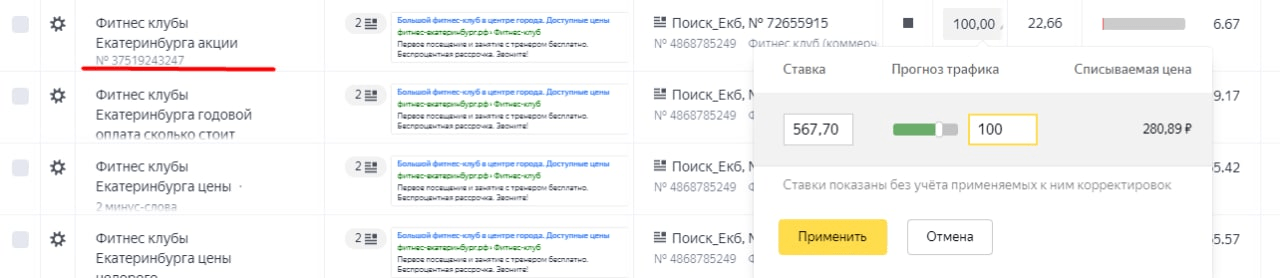 Наша максимальная ставка в день — 100 рублей. Ставка за попадания в топ была 567 рублей. При бюджете в 5000 мы не могли себе позволить такую цену клика