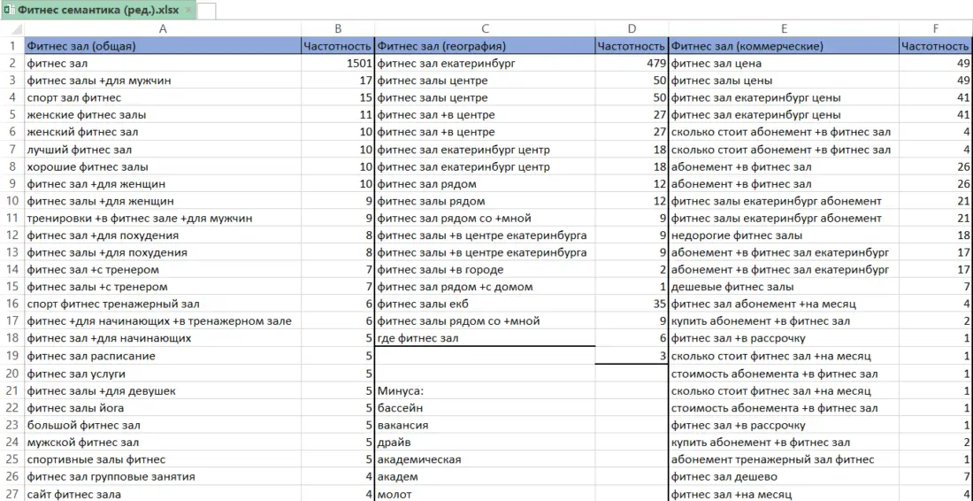 2. Собрали семантическое ядро и выделили ключевые фразы для настройки рекламы. Цель — сделать предложение клиентам, которые уже знают о услуге и выбирают между несколькими фитнес-клубами.