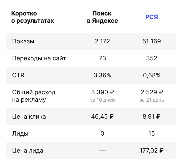 Результаты продвижения в РСЯ: 352 перехода на сайт, 9 рублей за клик, 15 лидов по цене 177 рублей