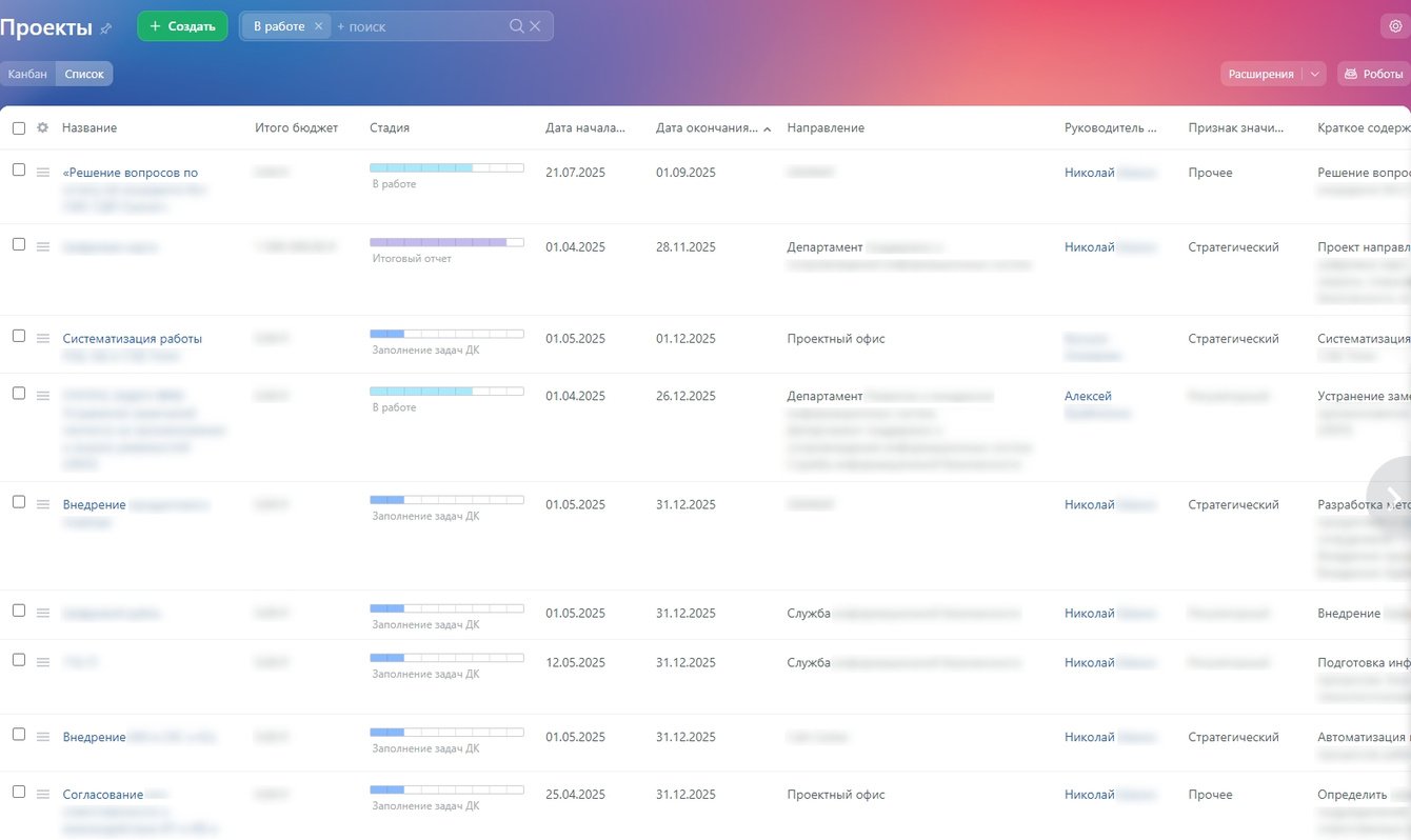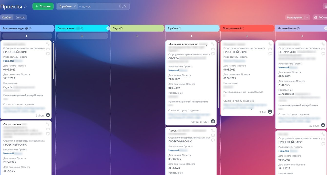 Обеспечена прозрачность статусов проектов, возможность фильтрации и поиска по стадиям, что упрощает управление и контроль.