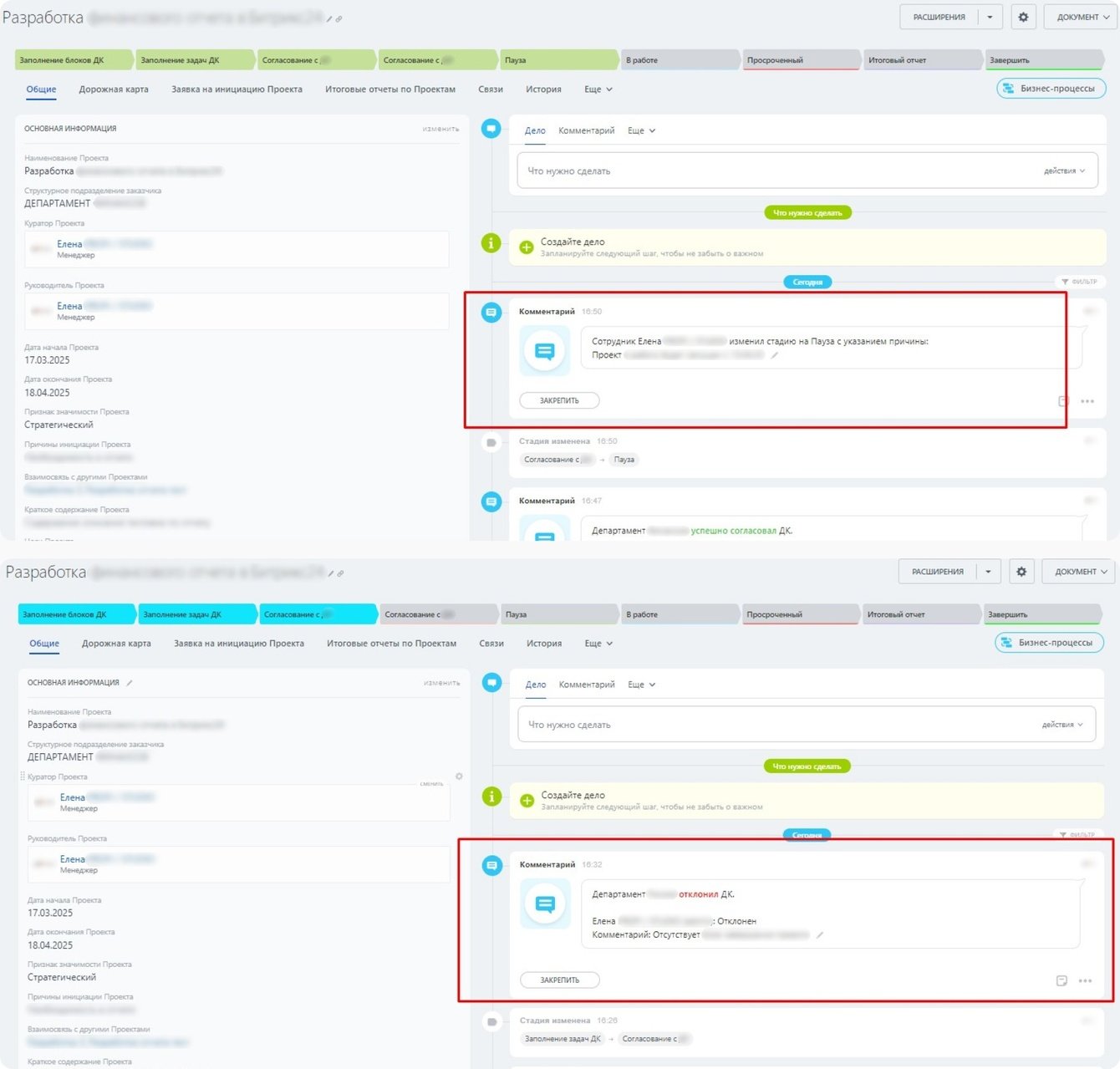 Это позволяет участникам проекта в любой момент увидеть, какие действия были выполнены, кто их инициировал, а также получить полную информацию о причинах пауз, комментариях и решениях, принятых на этапе согласования.