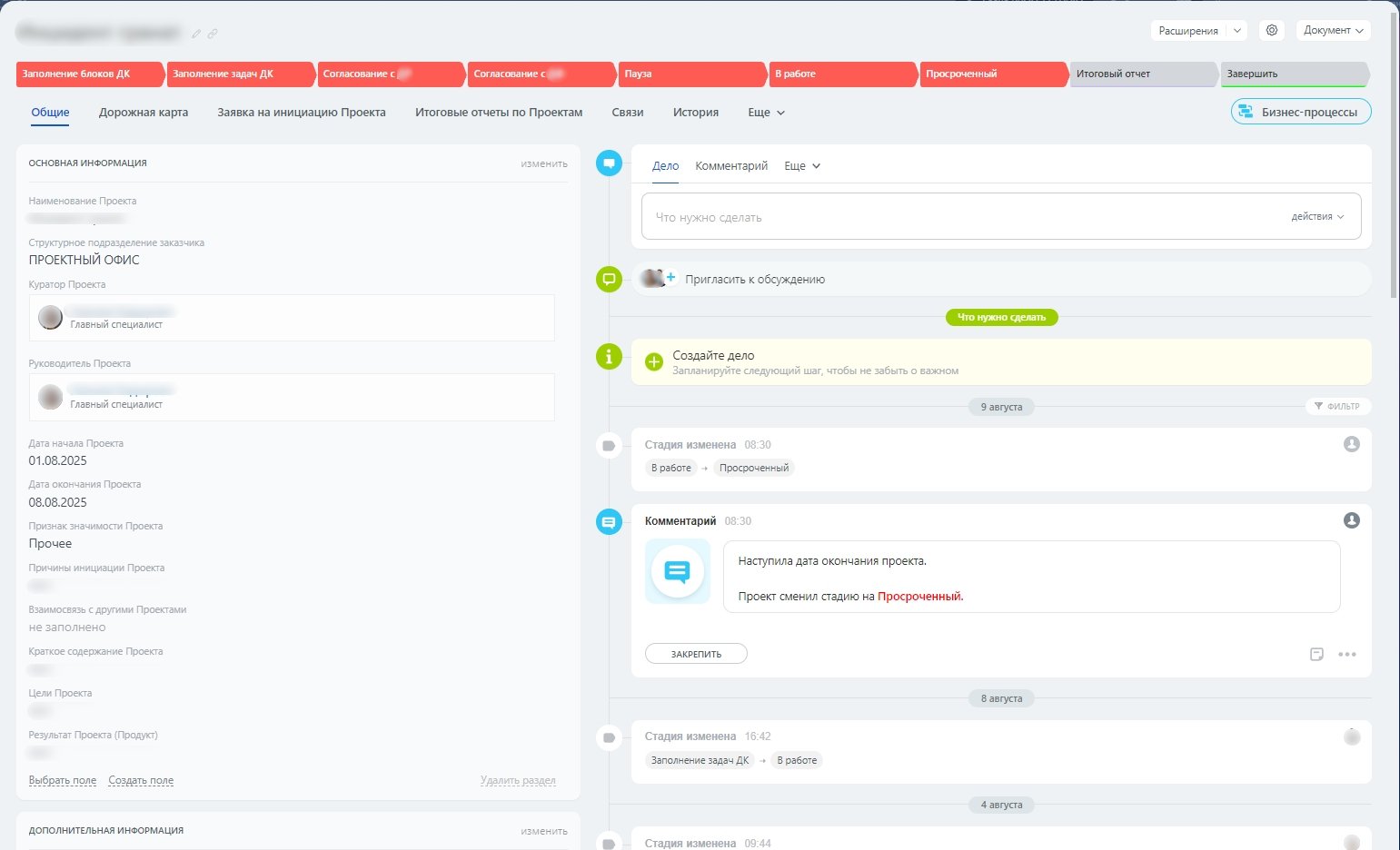 Теперь все ключевые действия (согласования, паузы, изменения статусов) фиксируются и доступны для просмотра, а причины приостановок видны также и на Канбане.