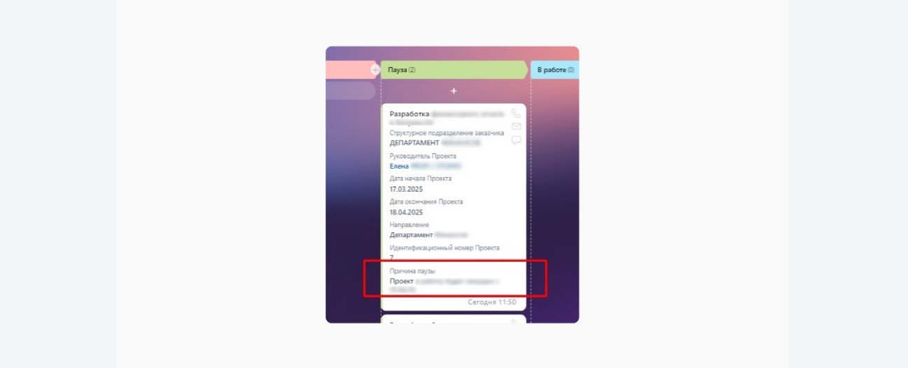 Для упрощения мониторинга мы также вынесли причину паузы на Канбан-доску проектов. Это позволяет команде быстро понимать текущее состояние проекта и основные факторы, влияющие на его выполнение, без необходимости заходить в детали проекта.