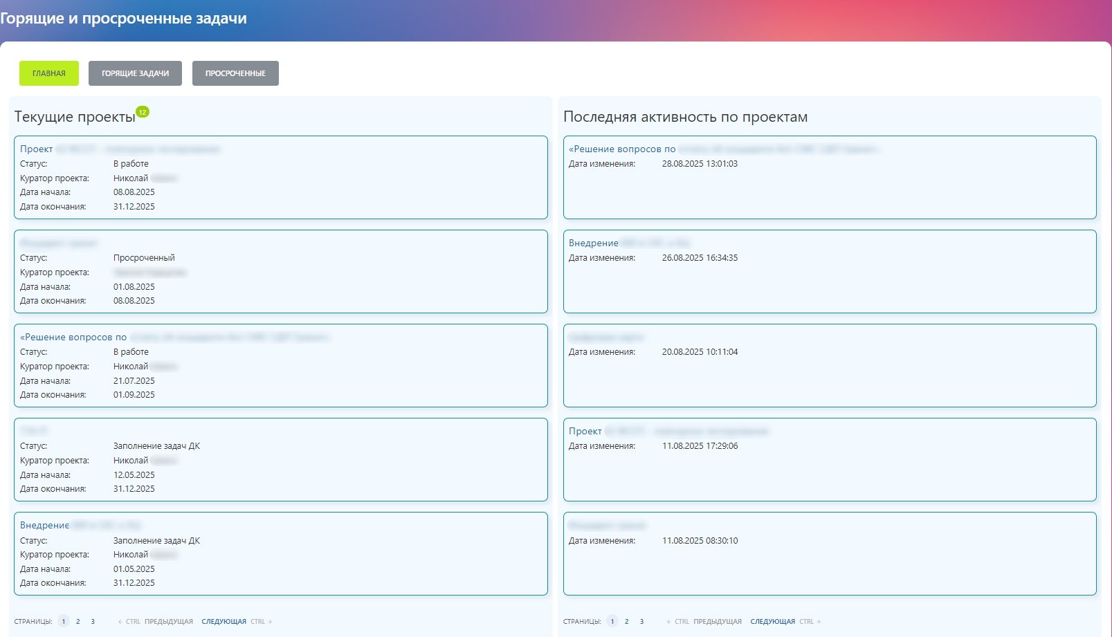 Дашборд текущих проектов — отображает основную информацию по проектам, их статусы, срок иактивность.