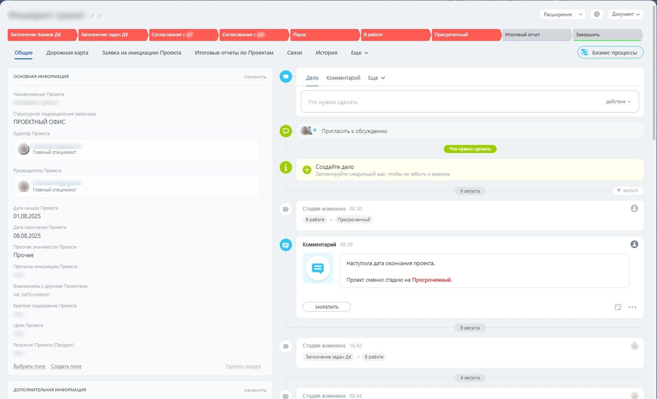 На основе бизнес-модели и требований клиента была разработана и внедрена карточка проекта, включающая: