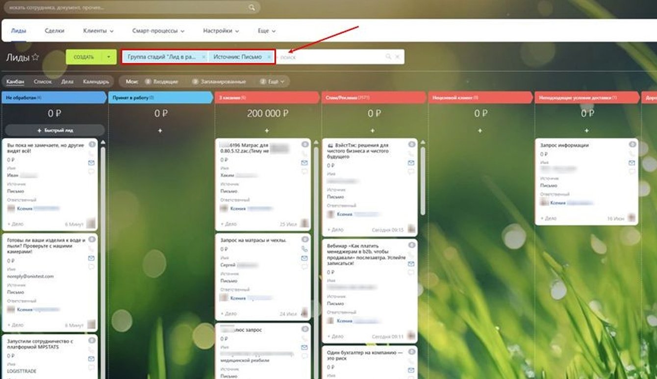 Мы реализовали возможность фильтровать по: стадиям, источнику лида, дате создания, дате изменения, ответственному сотруднику за лид.