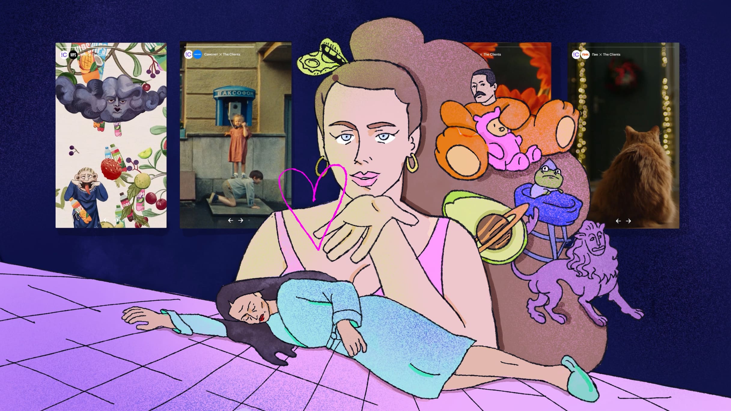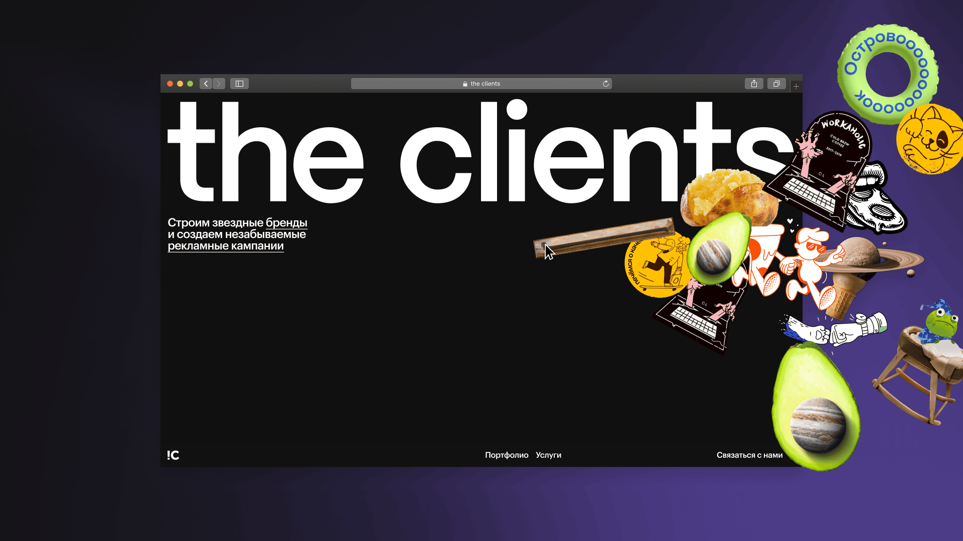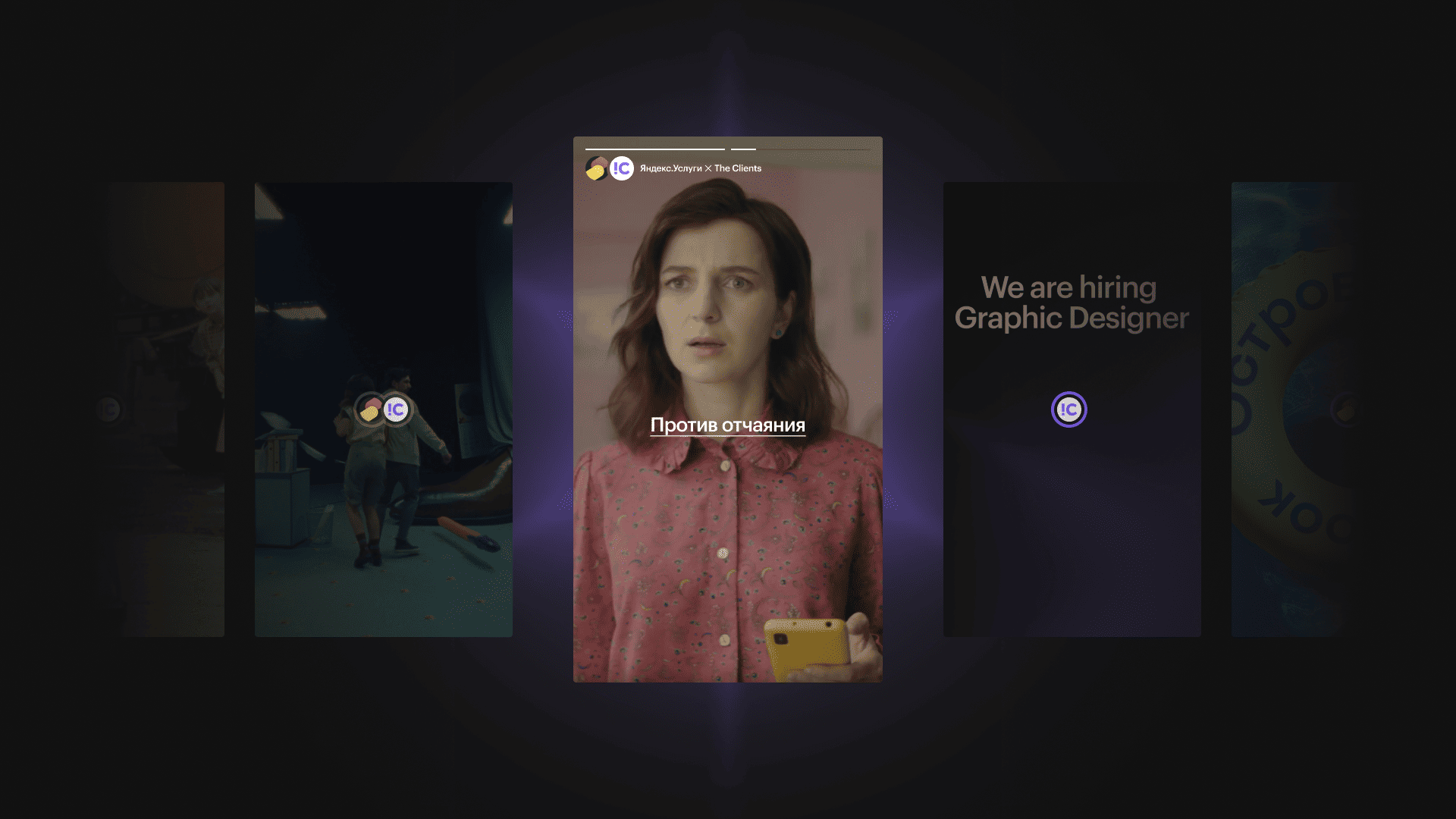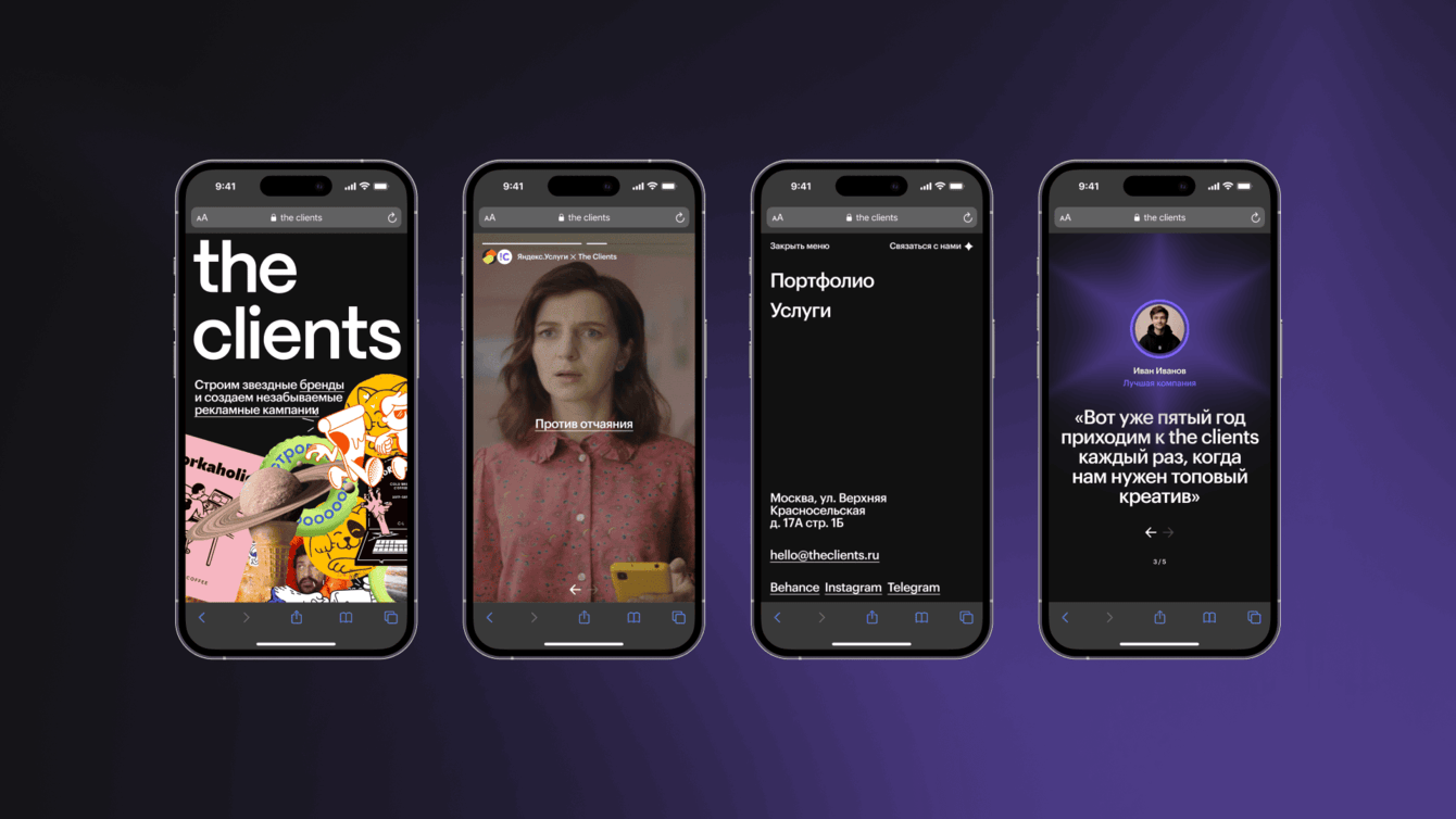 Ребята предложили механику динамичного контента в формате стикеров, которые отражают дух нашего агентства и вайб каждого знаменательного кейса в истории The Clients. Далее мы вместе решили сделать ленту сторис, как в соцсетях, чтобы листать сайт было просто и интересно.