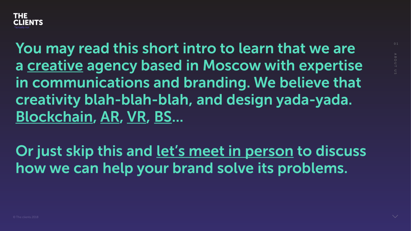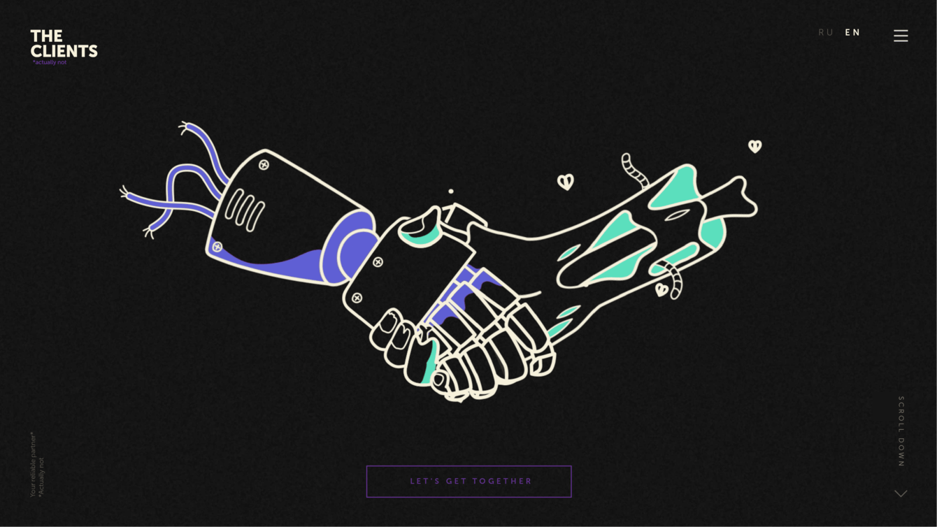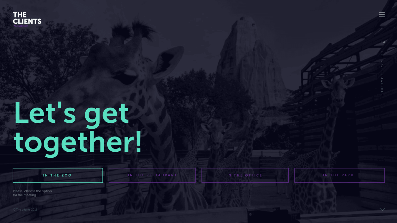 Сайт агентства — его лицо. Наше было «кирпичом»: ни навигации, ни фильтров — и минимум кейсов. Зато можно назначить встречу с креаторами в зоопарке. Привет, мы — The Clients. Хотели сделать взрослый и серьёзный сайт, но кое-что пошло не так. Что именно — смотрите сами.