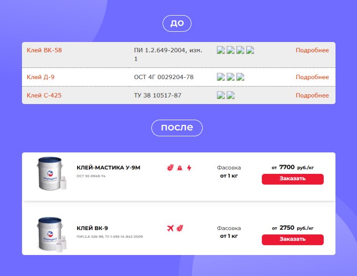 Изменили отображение листинга товаров: добавили новые фотографии, вынесли в листинг фасовку, так как это важный параметр для покупателей, и указали стоимость. Для того чтобы пользователь мог быстрее определить, к какой отрасли относится конкретный товар, в листинг были добавлены иконки, символизирующие отрасль применения. Например, при наведении на иконку самолёта появляется подсказка «Авиастроение».