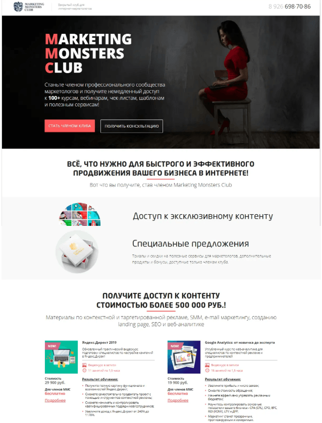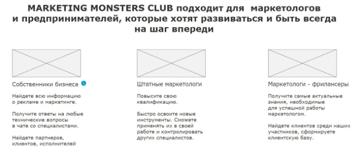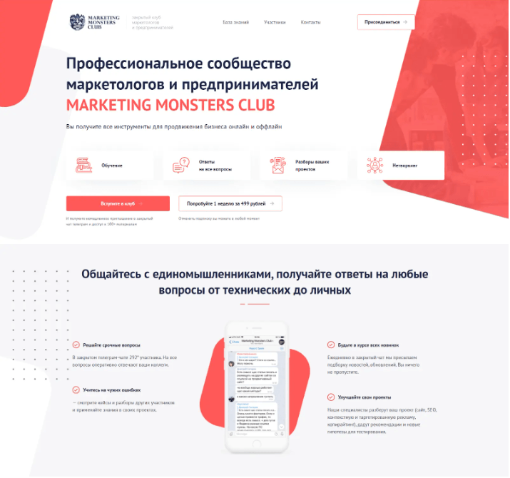 Прототип получился довольно лаконичным. Перед нами стояла задача объединить две целевые аудитории: владельцев бизнеса и маркетологов. Рассказали, чем клуб полезен и тем, и другим.