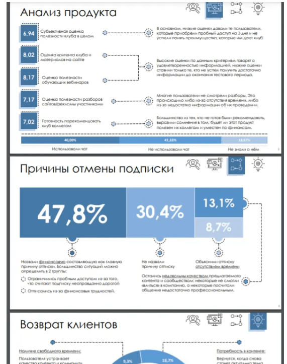 Мы разделили его на две части: количественную и качественную, чтобы собрать максимум разноплановых данных. Кого опрашивали? Бывших участников клуба. Логика простая: они когда-то купили подписку (значит, что-то их зацепило — наши сильные стороны), но потом отказались от неё (значит, есть над чем работать).