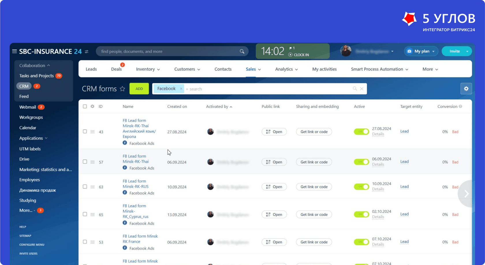 Распределение лидов по языкам и источникам, автоматизацию повторных и отложенных продаж, Telegram-контроль сроков, интеграцию с Facebook и персонализированными CRM-формами